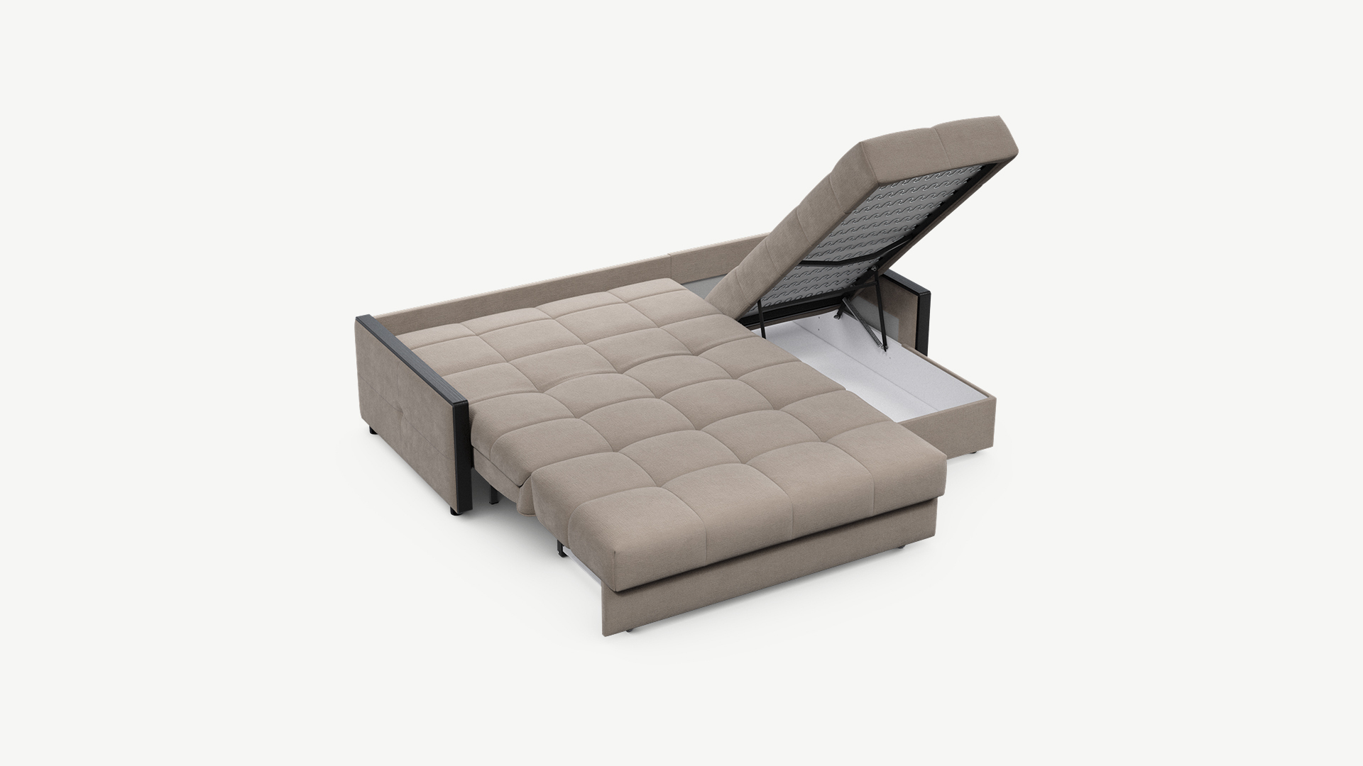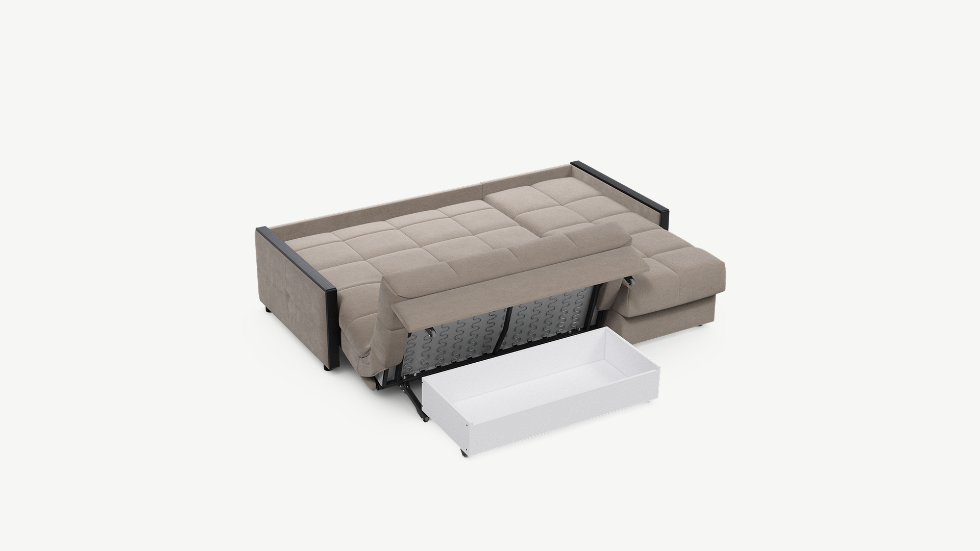 Оттоманка обеспечивает дополнительное пространство для отдыха, благодаря которому Вы можете располагаться с максимальным комфортом, вытянув ноги. Под данной секцией расположен вместительный бельевой короб.