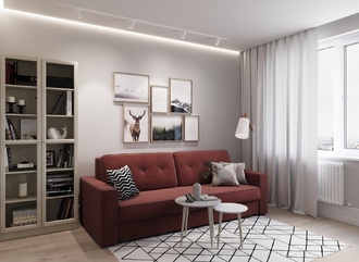 Спинка, выполненная в обивочной ткани, позволяет ставить диван в центре комнаты и зонировать пространство.