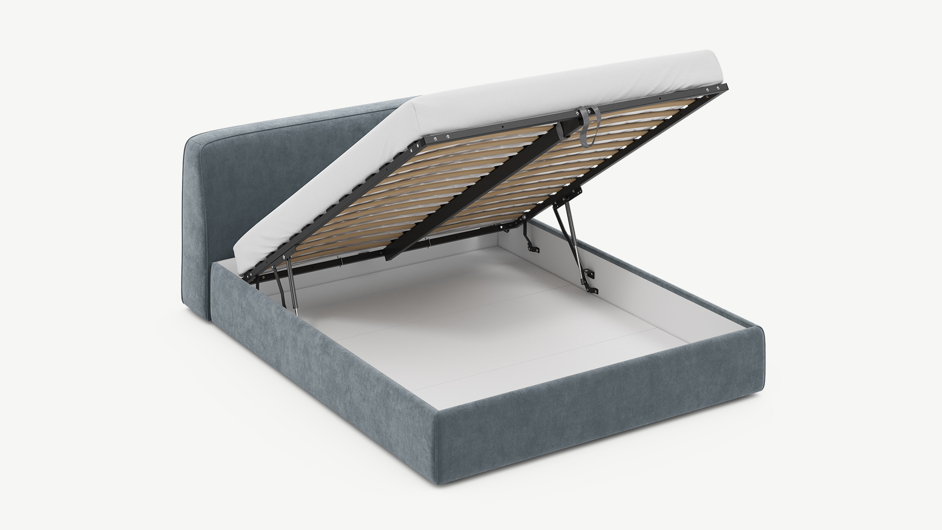 • Скрытая под основанием вместительная емкость без внутренних перегородок позволяет использовать всю площадь подкроватного пространства для хранения вещей.