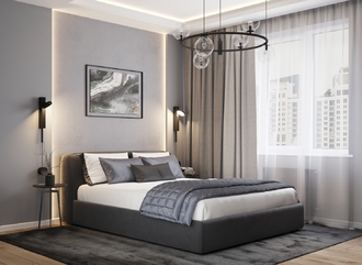 Обратная сторона изголовья выполнена в мебельной ткани и позволяет ставить кровать в центре комнаты для зонирования пространства.