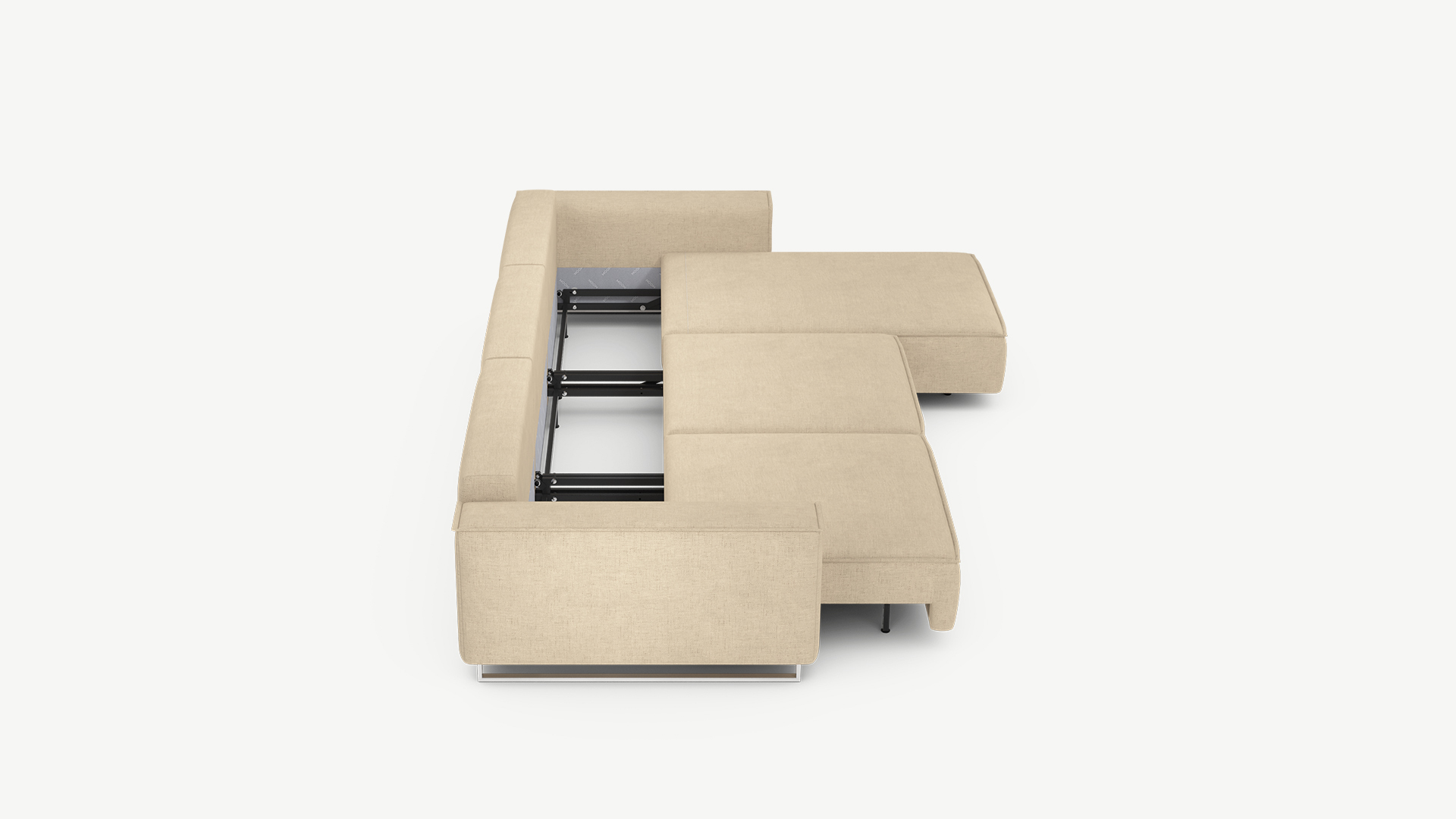 Благодаря высоким прямоугольным опорам под диваном проходит робот-пылесос и легко проводится влажная уборка, что обеспечивает чистоту и порядок в доме (при отсутствии бельевого короба под диванной секцией).