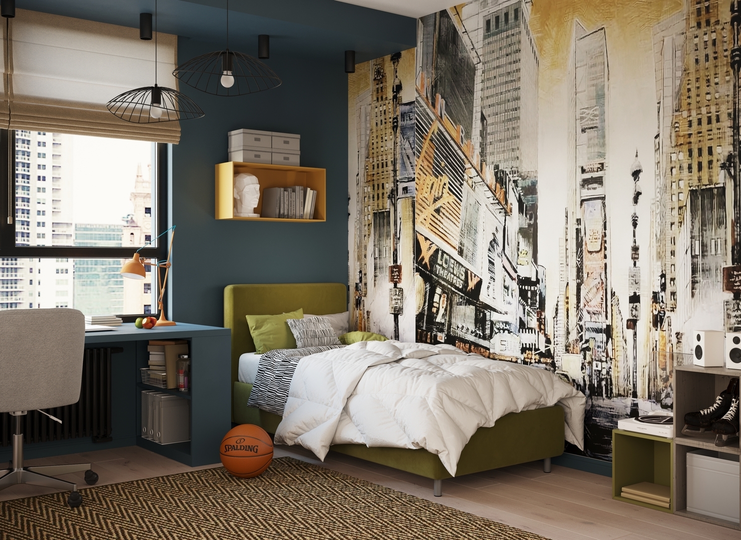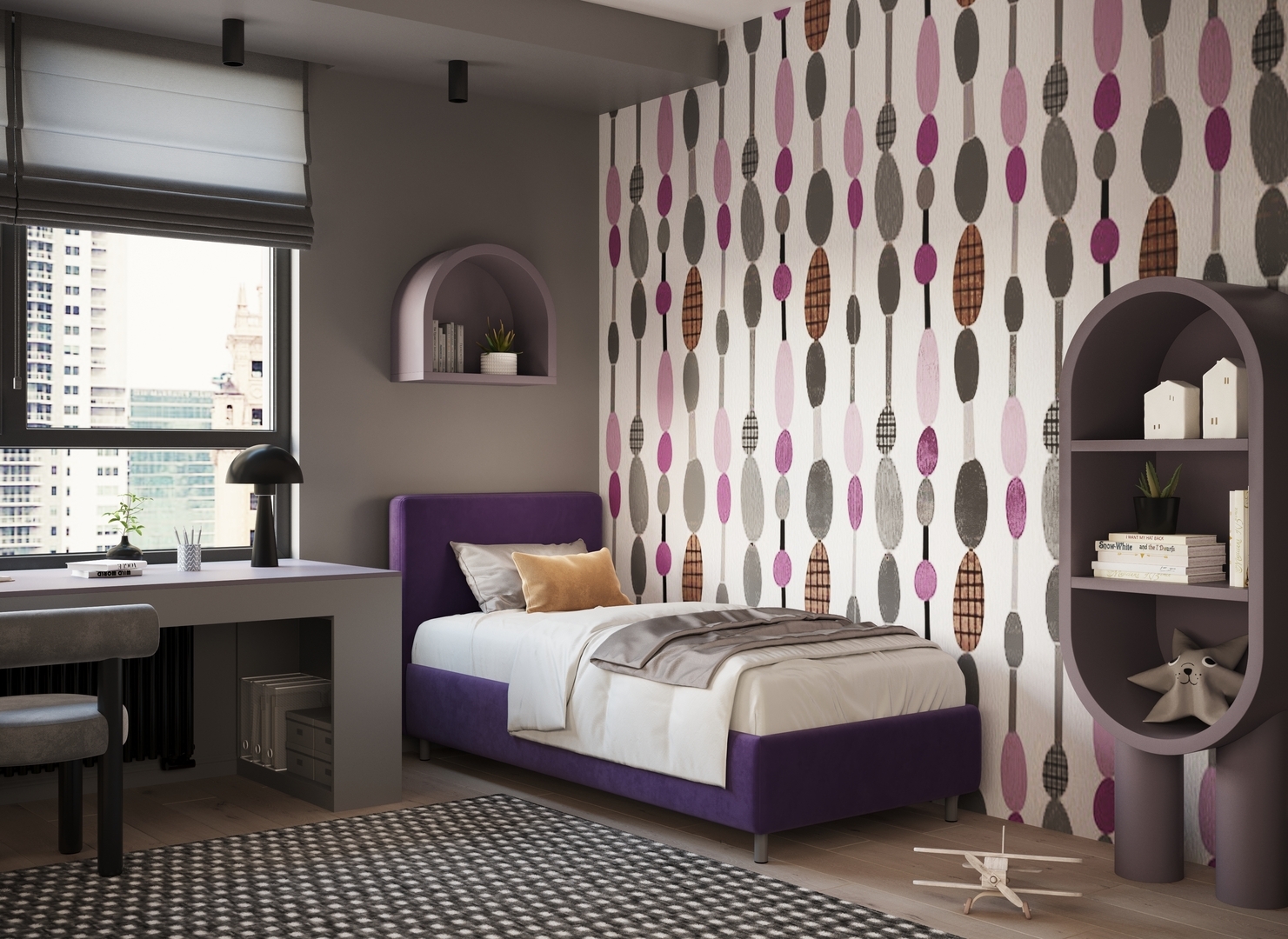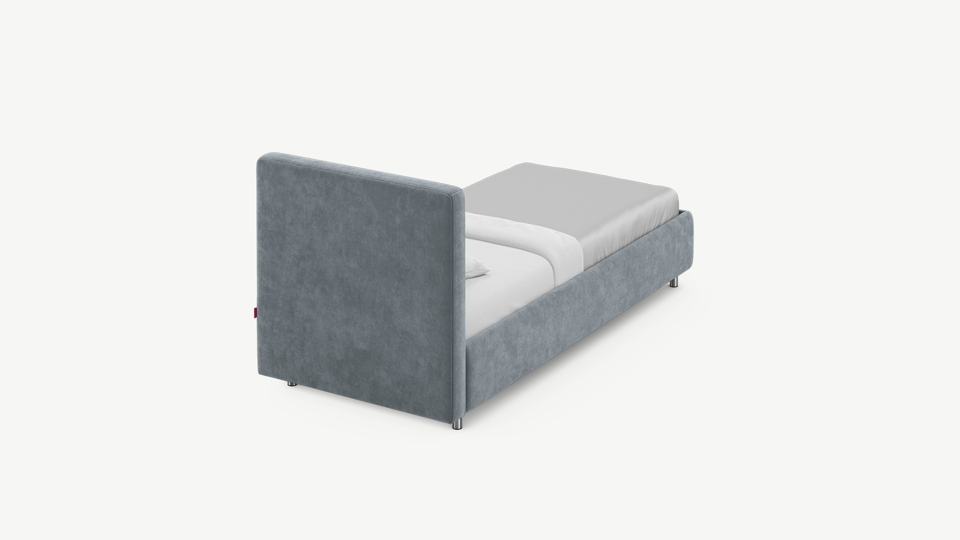 Обратная сторона изголовья выполнена в мебельной ткани и позволяет ставить кровать в центре комнаты для зонирования пространства.
