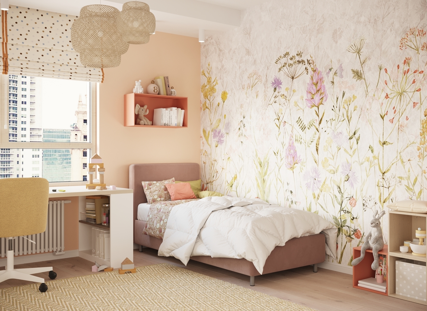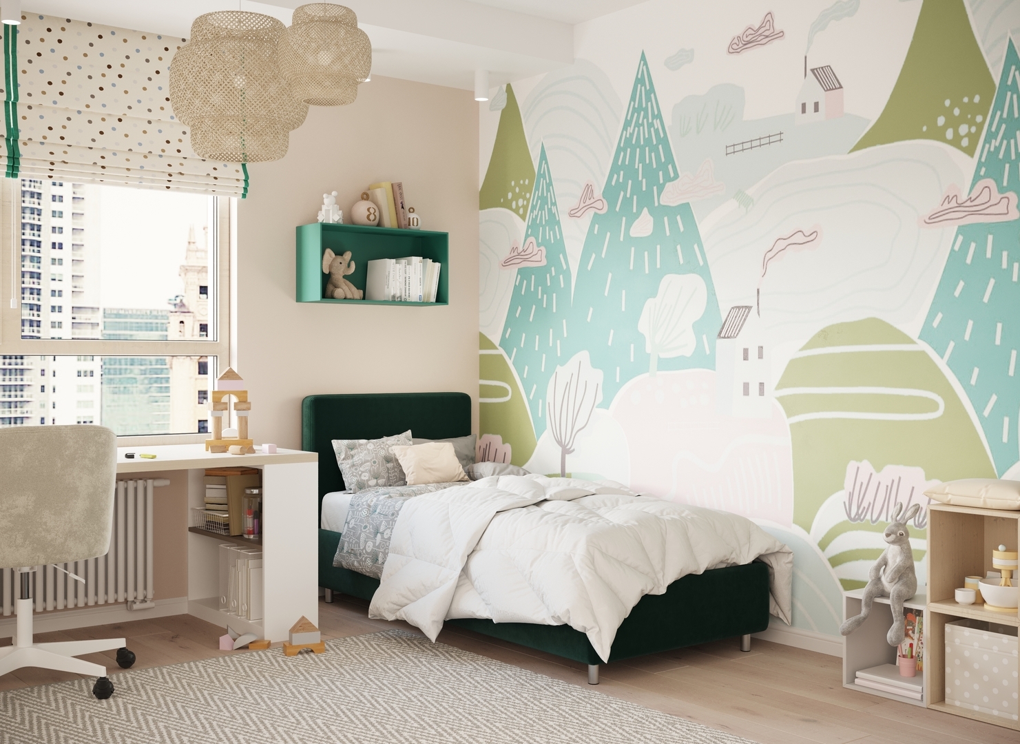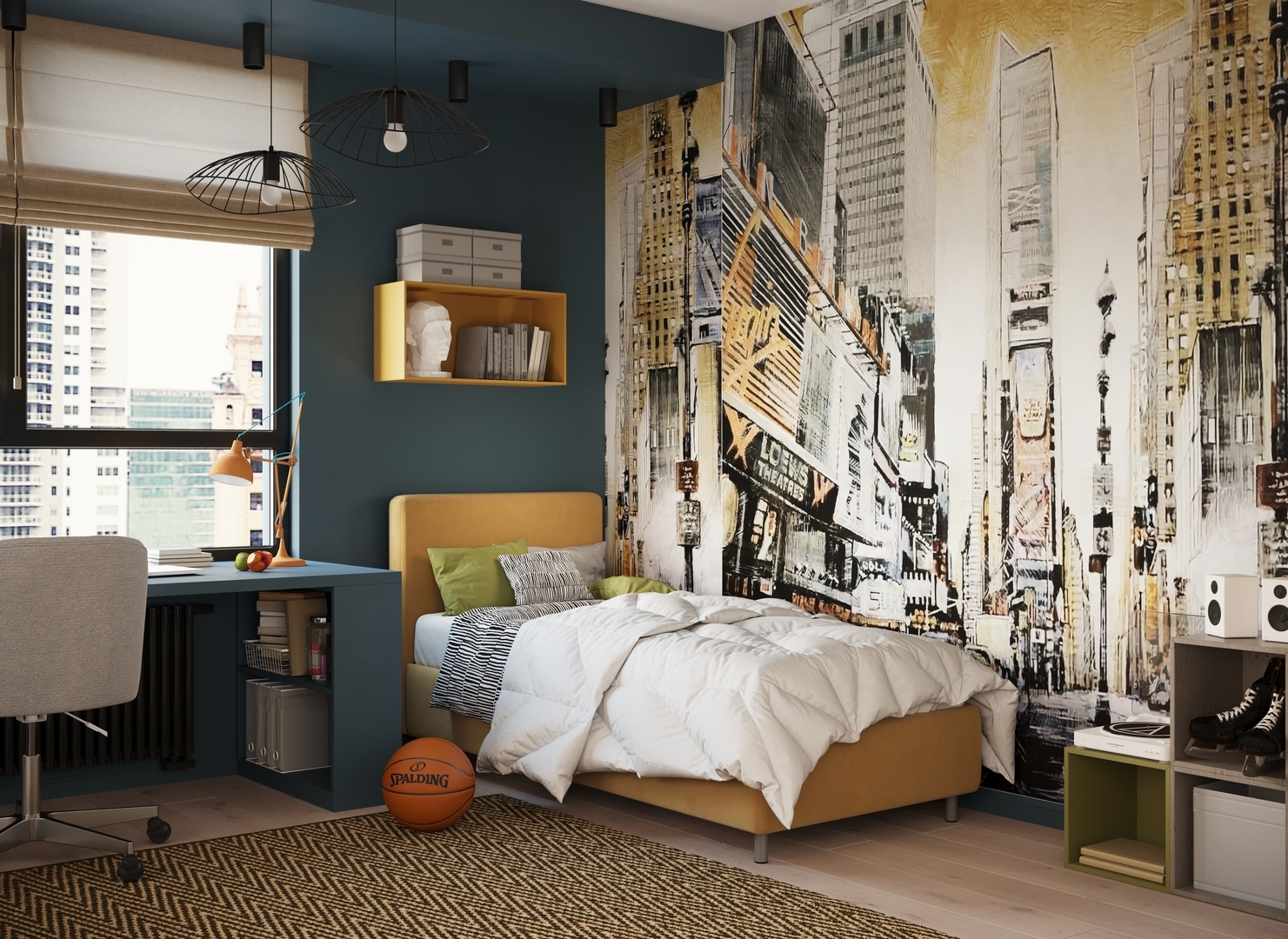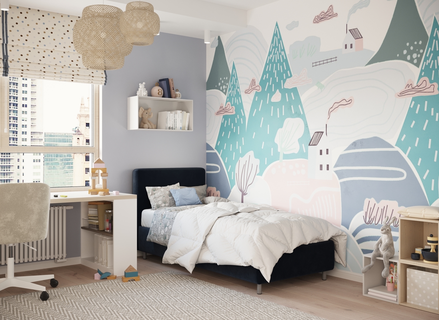 Обратная сторона изголовья выполнена в мебельной ткани и позволяет ставить кровать в центре комнаты для зонирования пространства.