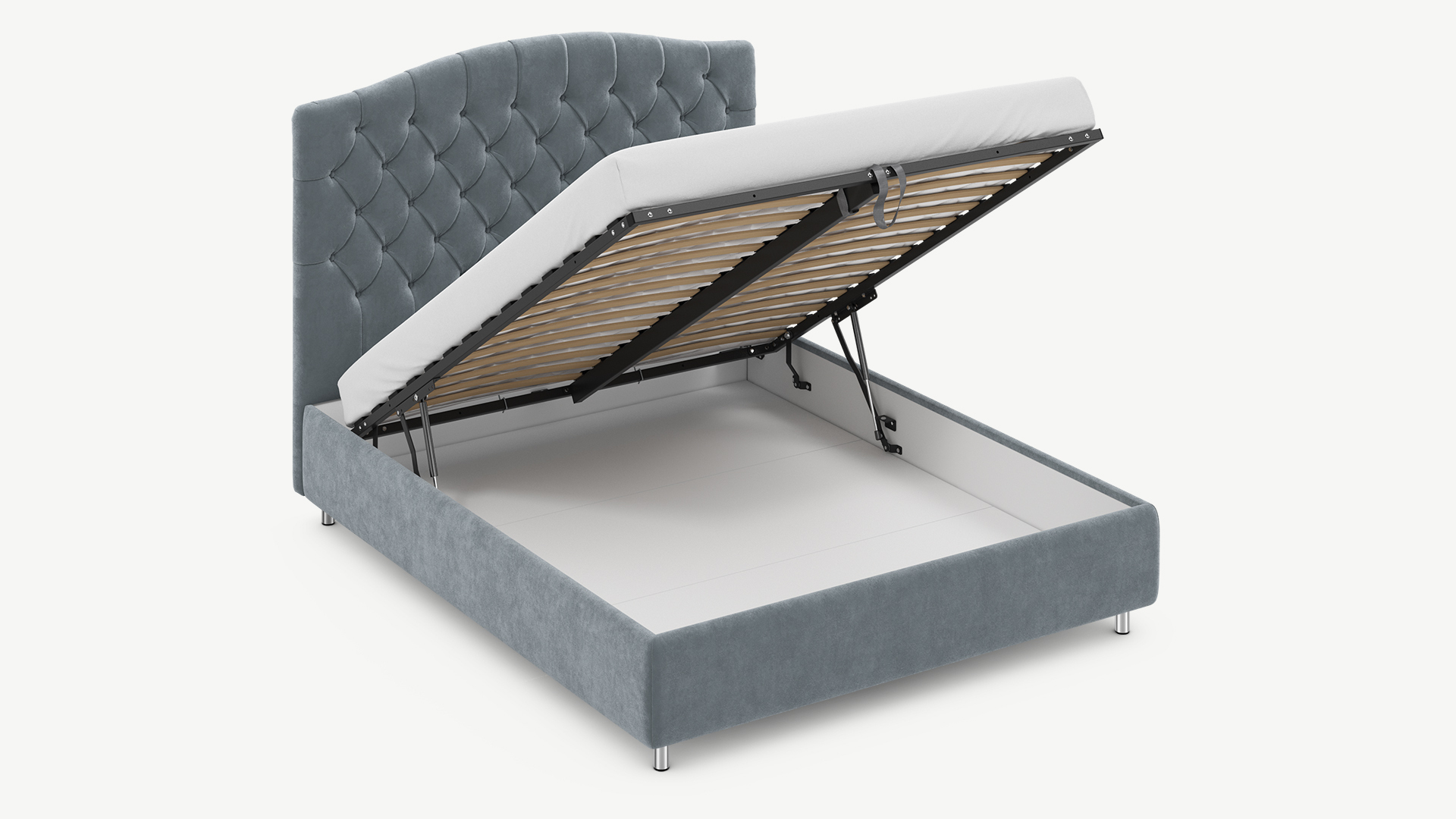 • Скрытая под основанием вместительная емкость без внутренних перегородок позволяет использовать всю площадь подкроватного пространства для хранения вещей.