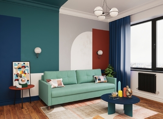Спинка, выполненная в обивочной ткани, позволяет ставить диван в центре комнаты и зонировать пространство.