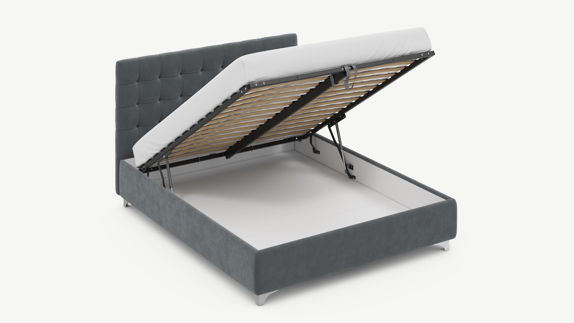 • Скрытая под основанием вместительная емкость без внутренних перегородок позволяет использовать всю площадь подкроватного пространства для хранения вещей.