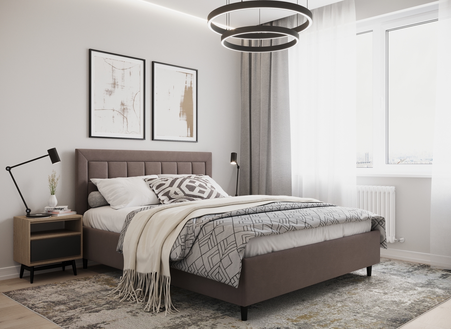 Создать гармоничный интерьер и завершить образ спальни помогут дополнительные аксессуары, например: тумбы, банкетки, подушки.