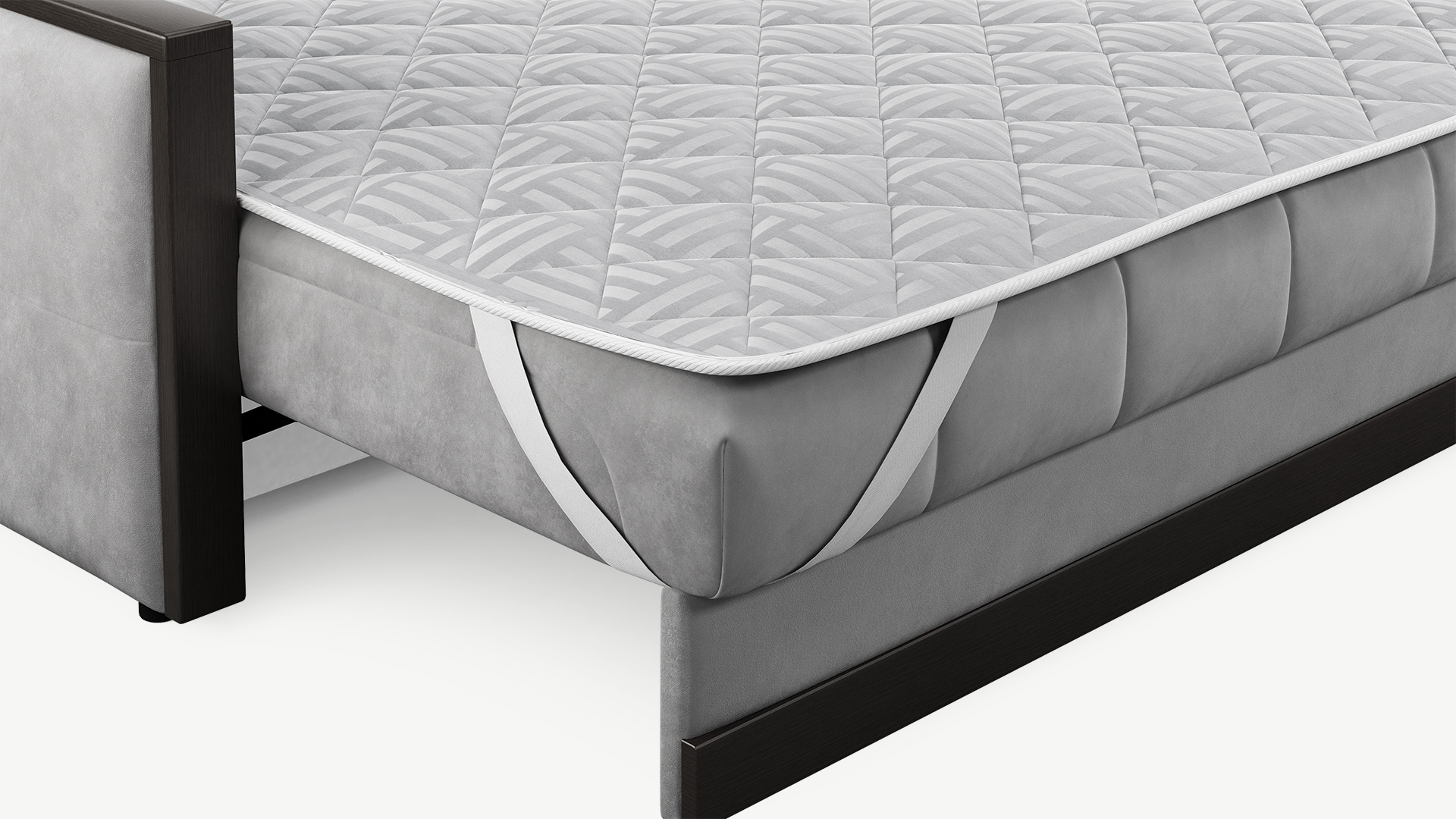 Наматрасник легко и надежно крепится к спальному месту с помощью широких резинок в четырех угловых точках.