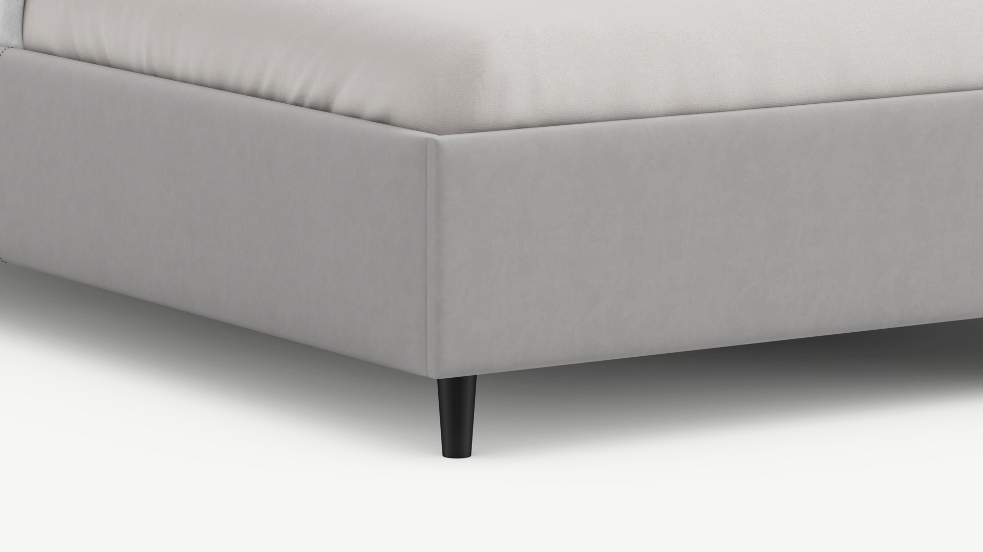 Царга, задающая пропорции, благодаря гладкости своей фактуры подчеркивает центральный элемент декора. Высокие опоры приподнимают фигуру кровати над полом и добавляют её образу визуальной легкости.