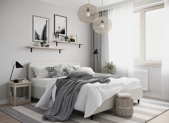Создать гармоничный интерьер и завершить образ спальни помогут дополнительные аксессуары, например: тумбы, банкетки, подушки.