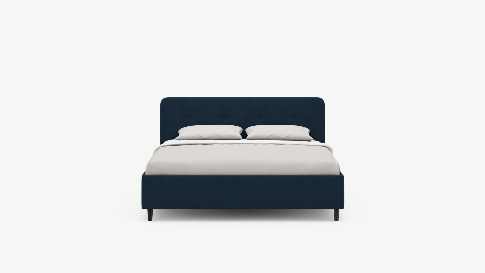 Царга, задающая пропорции, благодаря гладкости своей фактуры подчеркивает центральный элемент декора. Высокие опоры приподнимают фигуру кровати над полом и добавляют её образу визуальной легкости.