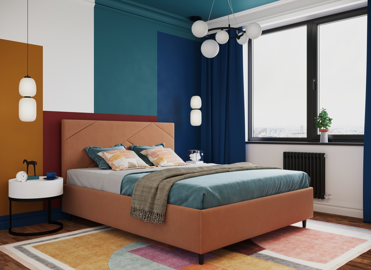 MOON FAMILY 1257 привлекает внимание оригинальным исполнением: широкие полосы ткани эффектно пересекают периметр изголовья, создавая на нем графический орнамент. Лаконичные формы объемных царг создают единый гармоничный образ и фокусируют внимание на центральном текстурном элементе кровати.