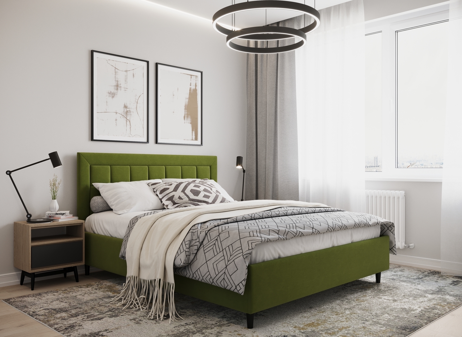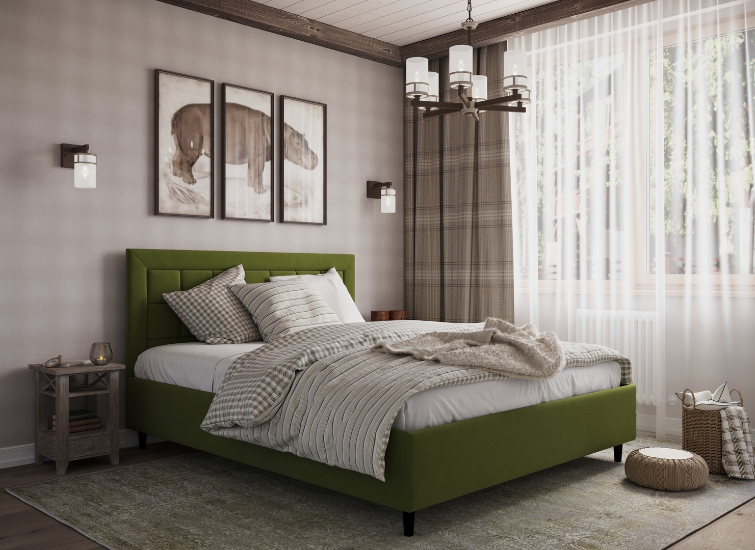 Стежка помещена в центр изголовья и обрамлена, словно картина. Объемные царги завершают цельную фигуру кровати и становятся гармоничным дополнением ее образа.