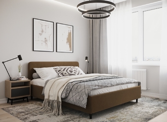Царга, задающая пропорции, благодаря гладкости своей фактуры подчеркивает центральный элемент декора. Высокие опоры приподнимают фигуру кровати над полом и добавляют её образу визуальной легкости.