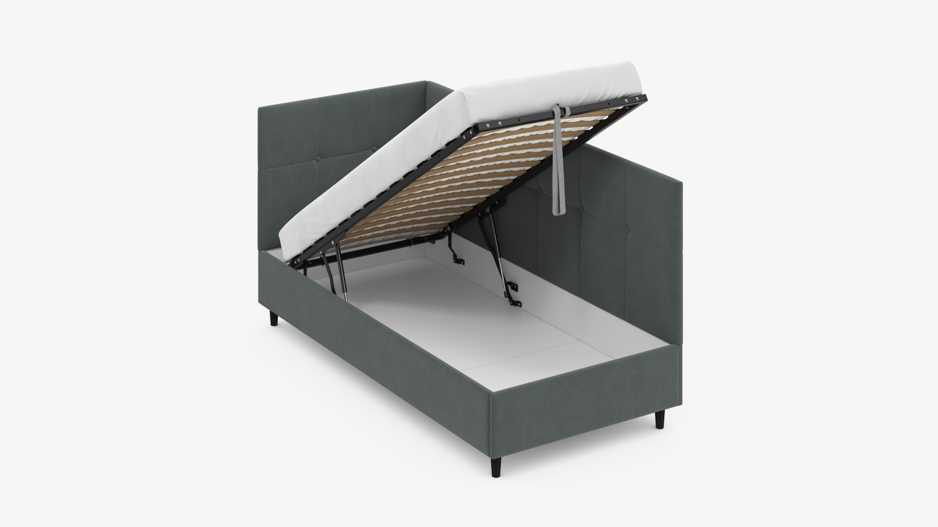 • Скрытая под основанием вместительная емкость без внутренних перегородок позволяет использовать всю площадь подкроватного пространства для хранения вещей.