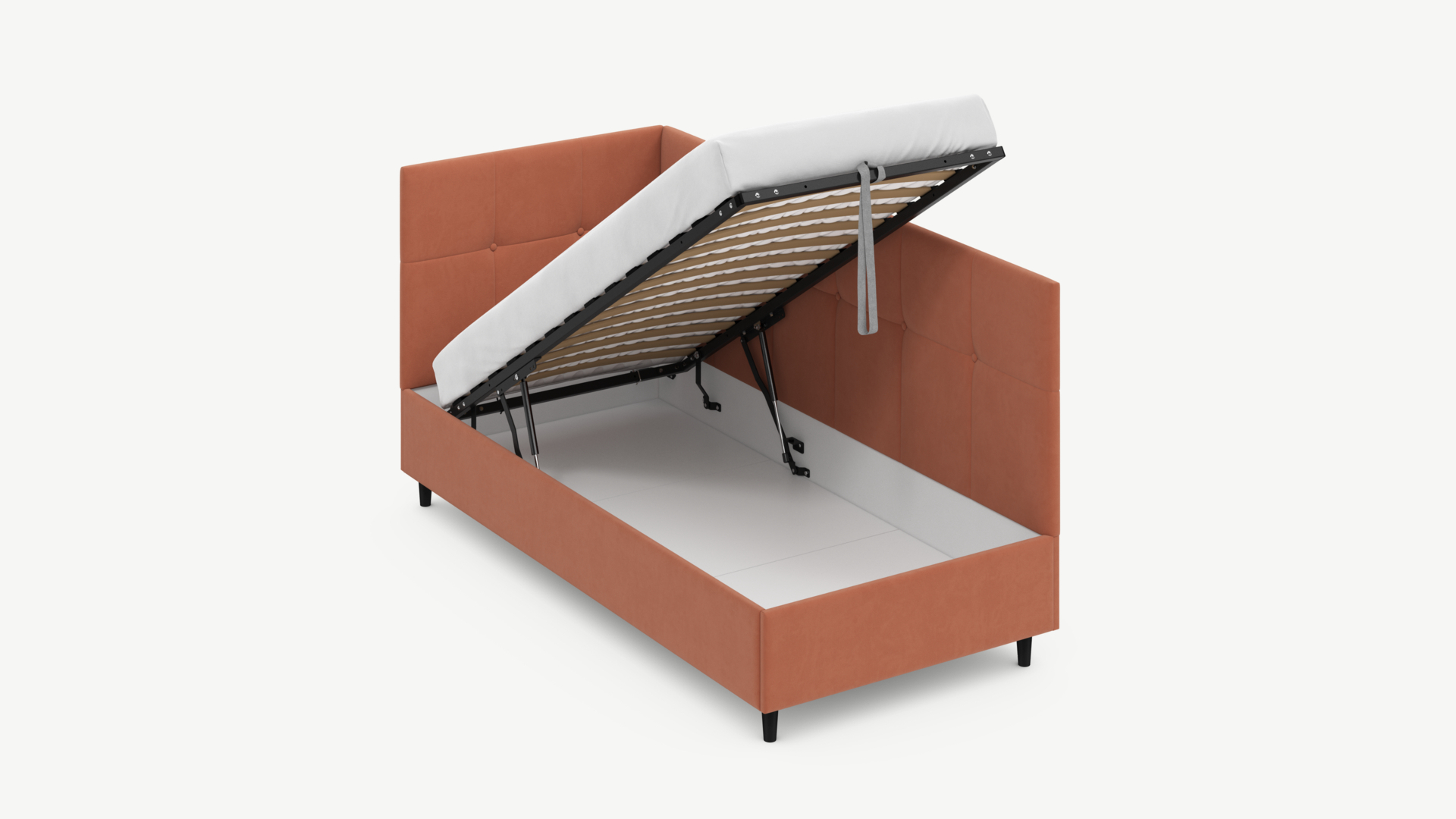 - Скрытая под основанием вместительная емкость без внутренних перегородок позволяет использовать всю площадь подкроватного пространства для хранения вещей.