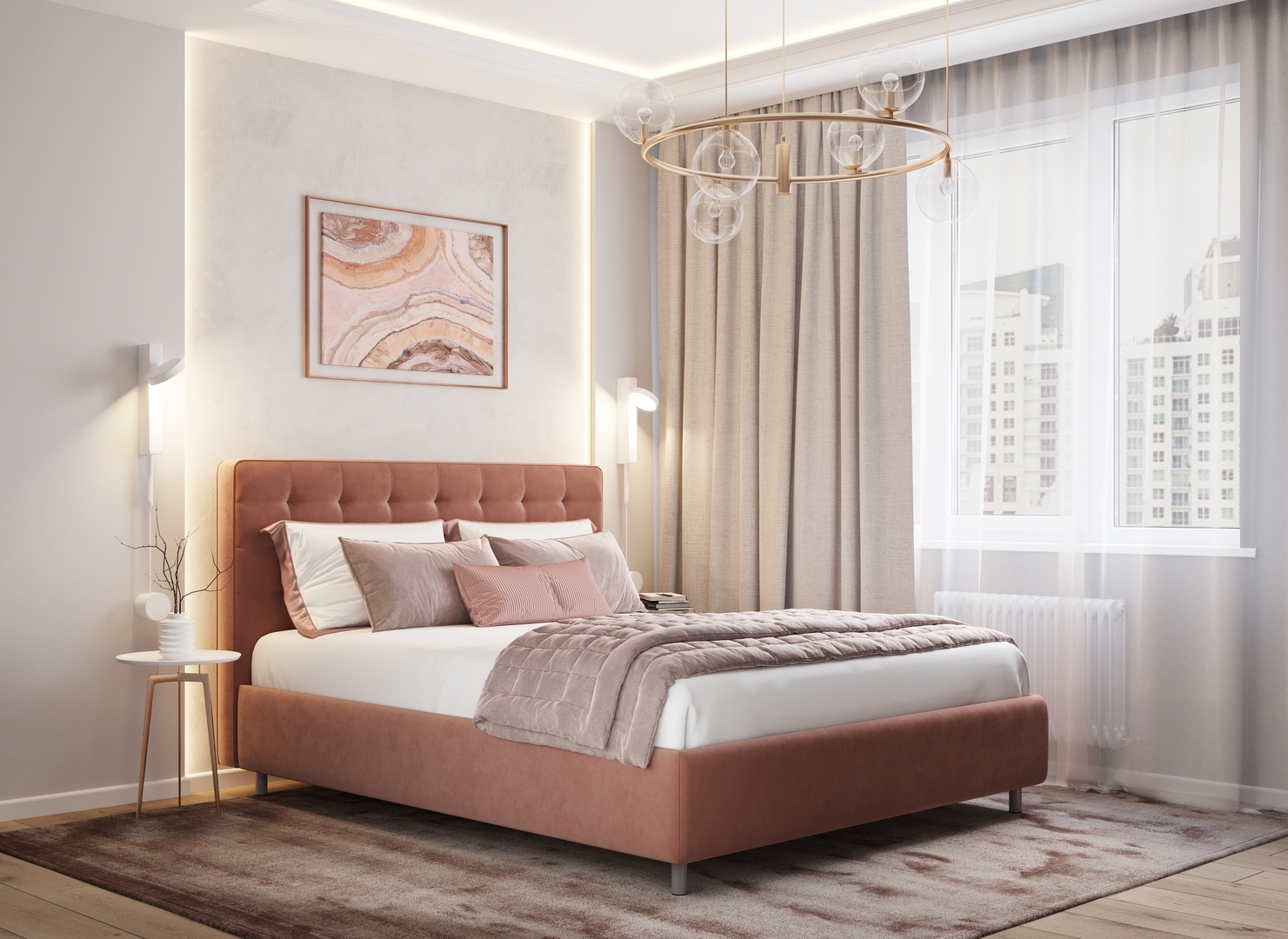 Оформите образ кровати, выбирая обивочный материал, который подчеркнет звучание Вашей спальни и отразит Ваш вкус. Обратите внимание на однотонный гладкий велюр, который усиливает объемную фактуру стежки.